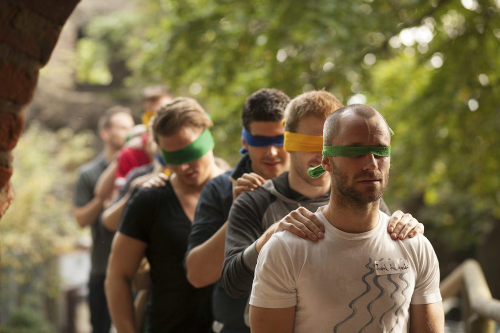 Eine Gruppe geht hintereinander mit verbundenen Augen und jeder legt die Hände auf die Schultern des Vorderen. Ein „sehender Führer“ lenkt die Gruppe von hinten nur mit Klopfzeichen.